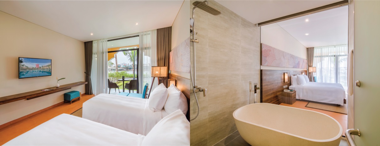Tất cả 102 phòng và villa đều có hướng nhìn trực tiếp ra sông Hoài, khoác lên sắc vàng đặc trưng của Hội An kết hợp hài hòa cùng kiến trúc đương đại mang đến không gian đầy cảm hứng, bình yên.