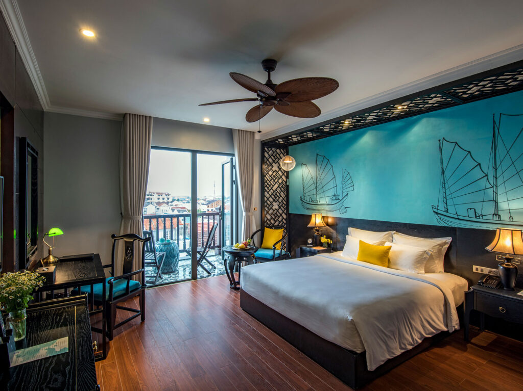 Phòng ngủ có bàn làm việc riêng tư tích hợp bàn trang điểm xinh xắn, đầy đủ tiện ích để giúp cho du khách có được một không gian làm việc thoải mái nhất. Điểm nhấn của căn phòng nằm ở bức tường xanh được vẽ thủ công với họa tiết những căn nhà cổ tại Hội An, tạo cảm giác gần gũi, đặc trưng và quen thuộc cho bất kỳ du khách nào ghé thăm. Ngoài ra khi mở cánh cửa gỗ, du khách sẽ đến với ban công lộng gió – là nơi nghỉ ngơi thư thái và nhìn ngắm cảnh đẹp xung quanh.