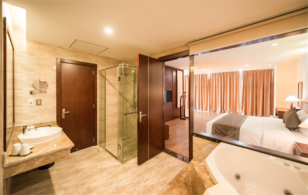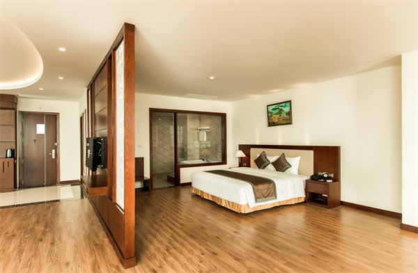 Phòng với diện tích 95m2 gồm một giường king size 2,2m x 2m với không gian rộng rãi và thoáng mát, đầy đủ các thiết bị nội thất nhằm đem lại sự thoải mái nhưng không kém phần sang trọng và đẳng cấp mà khó có thể nào tìm được ở một nơi khác.
