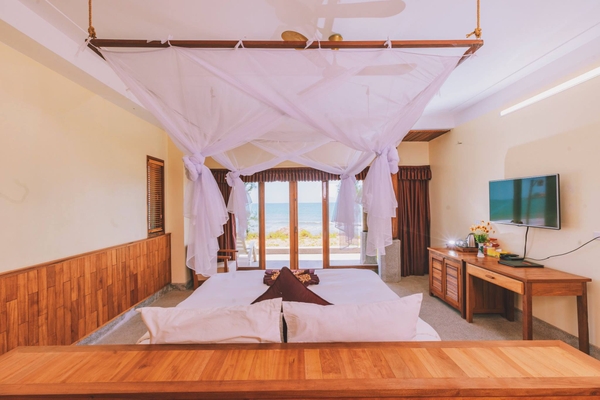 Deluxe Twin/King Ocean View Diện tích: 32m2 Hướng biển Phòng dành cho 2 người và 2 bé dưới 6 tuổi Phòng có 1 giường đôi cỡ lớn hướng biển ( Tầng 1 hoặc tầng 2)